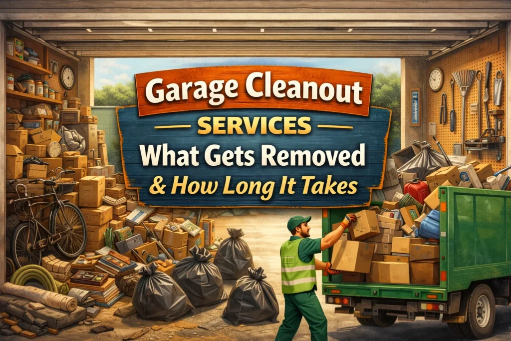 This guide covers everything you need to know about garage cleanout services. What they’ll actually remove. What they won’t touch. How long the whole process takes. And what you should expect to pay.